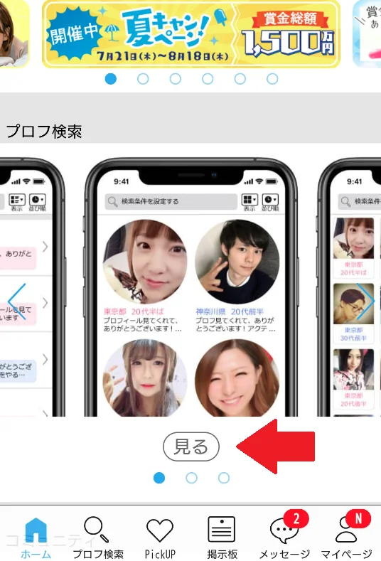 プロフィールを全て書き込んだらハッピーメールのトップページにある『プロフ検索』の『見る』をクリック。