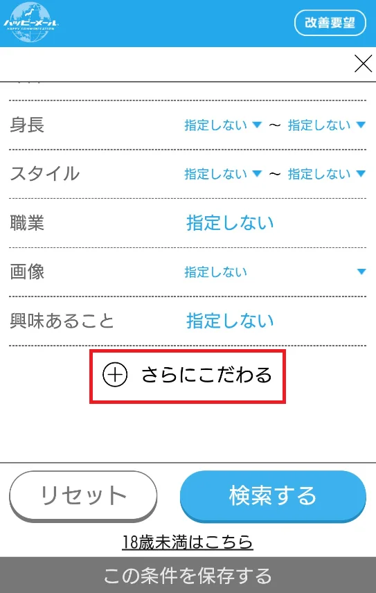 出会いたい地域を設定したら1番下にある『さらにこだわる』をクリック。
