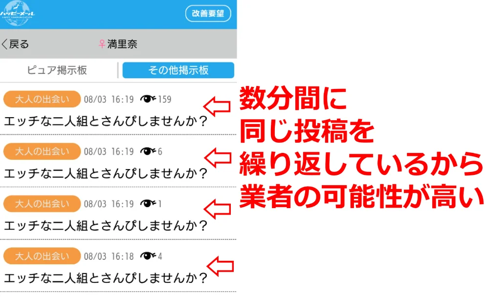 するとその他掲示板(アダルト目的の掲示板)に書き込みをした女性が一覧になって表示されます。