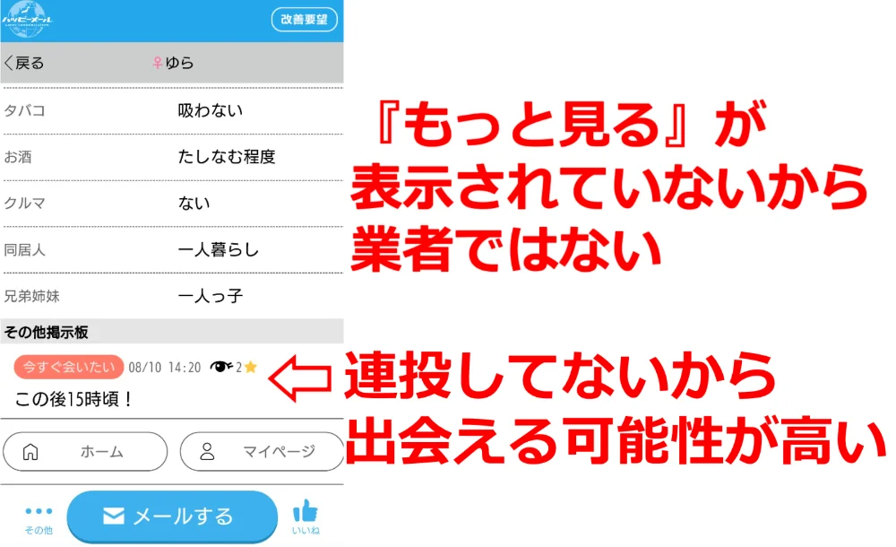 掲示板からメッセージを送れる場合はプロフからではなく、掲示板の投稿ページから送信すると返信率が高くなります。(相手は掲示板を見た人だと分かるため)
